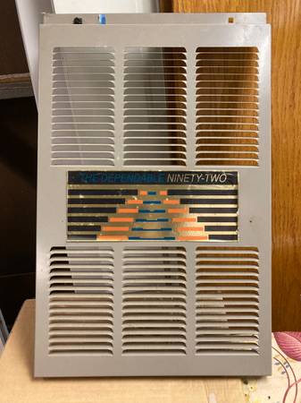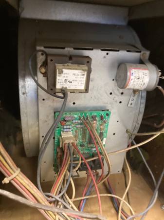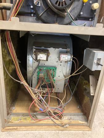 Goodman high efficiency natural gas furnace. I removed this prior to demolition of a house I owned. I believe it's from 1998. It worked great until 2007 when my tenant moved out. The house sat vacant, so the furnace was not used but was protected inside the house. Being a high efficiency furnace, the exhaust is ducted via PVC pipe, instead of needing a vertical chimney. It can be installed just about anywhere near an exterior wall. 91% efficiency (72,000/ 80,000 BTUs = 91%). Requires just a 15 Amp electric circuit. 1/2 hp, 3-speed blower. Goodman model# GMPN 080-4 Considered a multi-position unit. Air output is on top. Air intake is underneath. Furnace base is temporarily mounted to plywood to make it easier to move. Measures 16" wide x 46" tall x 28" deep.