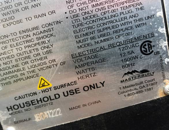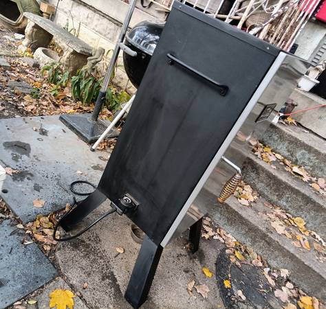 Masterbuilt Electric Smokehouse model 20070712. 1500W. Gently used and reasonably clean (I cleaned it right before listing). Manual temperature control dial and built-in thermometer. Includes removable chip pan, water pan, and racks.