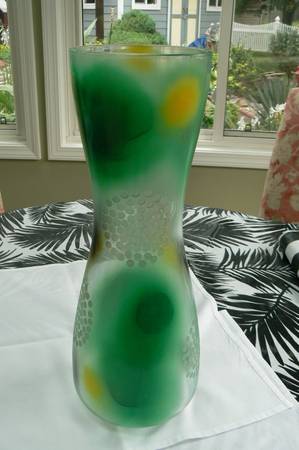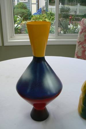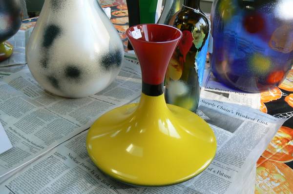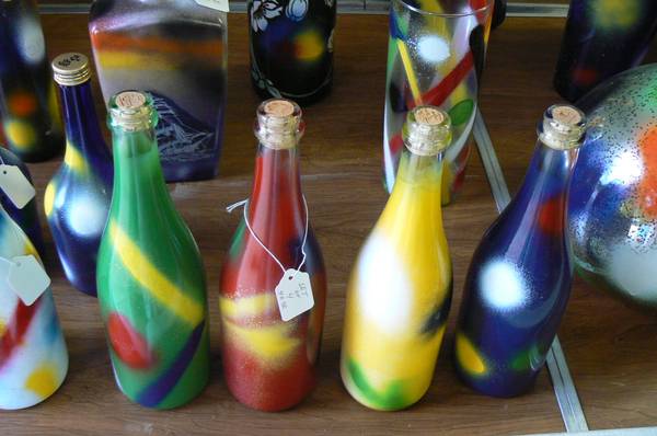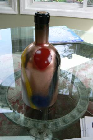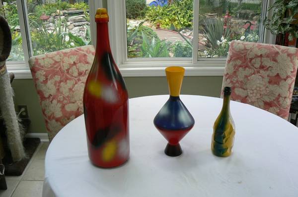Art by Gabe, painted bottles / vases. from 10.00 and up. The last tall red bottle is 2 feet in height. The last blue bottle is 28 1/2 inch tall.
