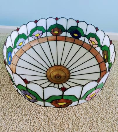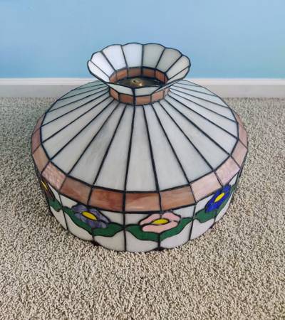 Stunning stained-glass shade handmade by a local artist in Lafayette, Indiana. Originally purchased for a home install, but it turned out too large for the intended space. Exceptional craftsmanship featuring vibrant floral motifs in rich reds, purples, and oranges, framed by green leaves and bordered with elegant, scalloped detailing. Glows beautifully when lit, casting warm, colorful reflections with vintage charm.