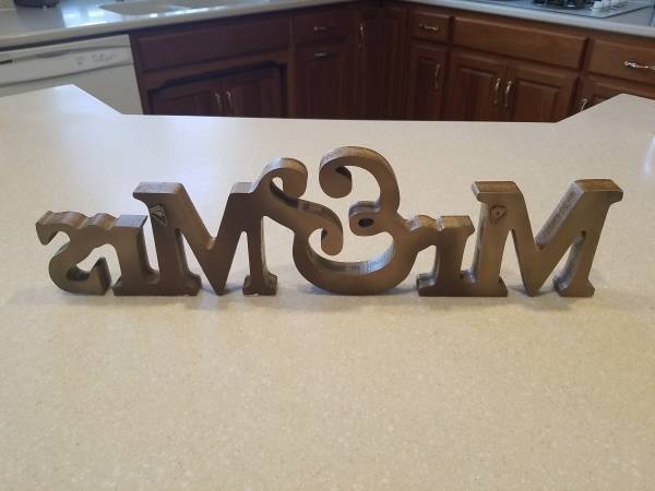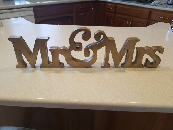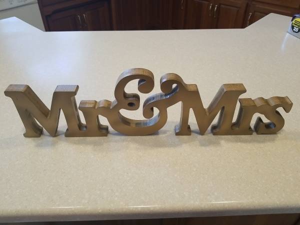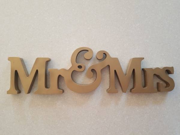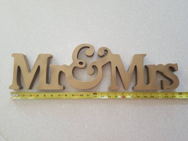 Lg Gold Mr & Mrs Wooden Letters Wedding, Shower Table Stand Sign Party Decor. Slight blemishes- white paint on back, otherwise very good condition. Great for Wedding decor, bachelorette parties and shower decor. Used for one wedding. Almost 24" long x 6.5" high, see photos!!