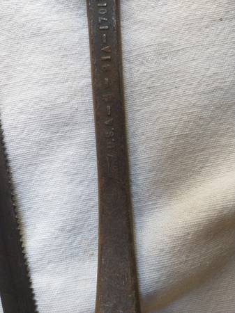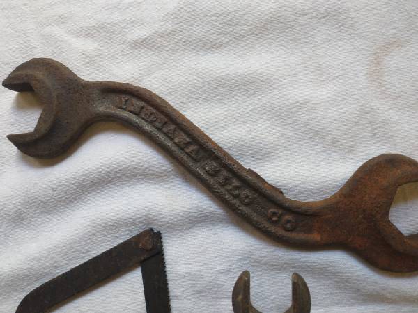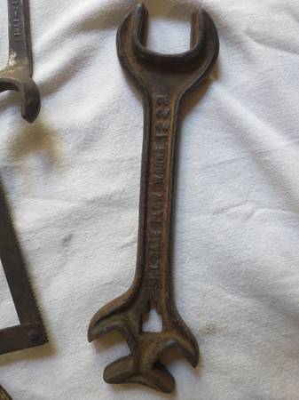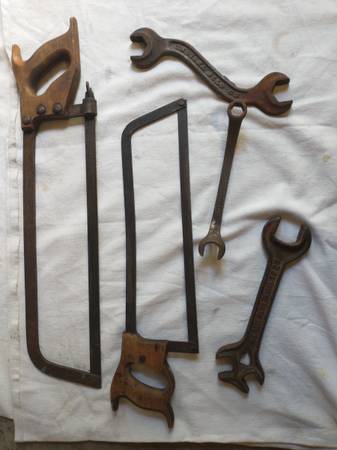 (2) saws, (1) Ford wrench,(1) JL Case wrench, (1) Indiana Silo Co wrench
