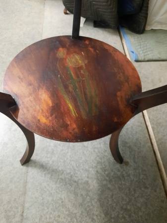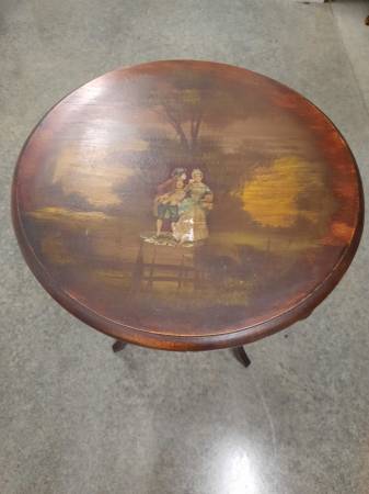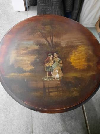 This is a small antique side table featuring two beautiful, classical oil-style paintings, one on the table top and another on the lower tier. I do not know the date of production or manufacturer. Please see pictures to make your own judgment. There is some damage to the table edge and to the table top, which can be seen in the pictures. The table also comes with a round glass top, however, I took that off to take the pictures since it caused some glare. But the glass surface top will come with the table.