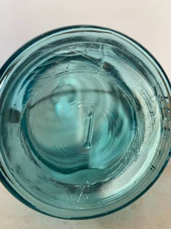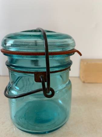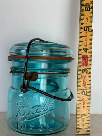 Was $145.00. On sale for $90.00. Very rare and hard to fine Antique 1/2 pint Blue Ideal Glass Ball Fruit Canning Jar with Glass Top and Wire Bail early 1900's, around 1908 Excellent condition.