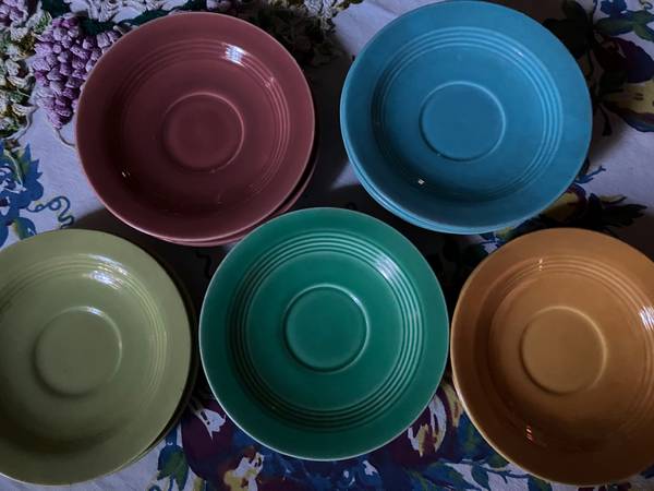 One dozen authentic Harlequin (by Homer Laughlin, made exclusively for Woolworth) saucers in assorted colors, 1930s-1950s. These are in perfect condition but for two that each have a small chip on the bottom. 2 green, 2 yellow, 4 turquoise, 2 rose, 2 chartreuse. Reduced to $20 for all 12 saucers.