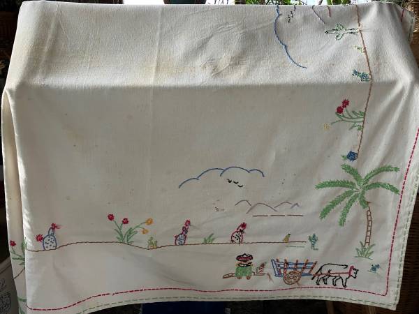 Vintage embroidered linen tablecloth with Mexican themes all the way around. Roughly 62 inches x 48 inches. No holes, but it does have "age patina": faint stains here and there. See photographs. $8. Make an offer.