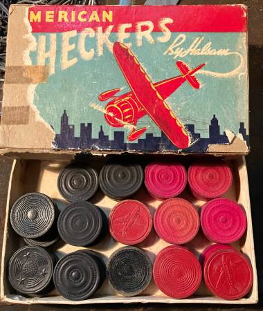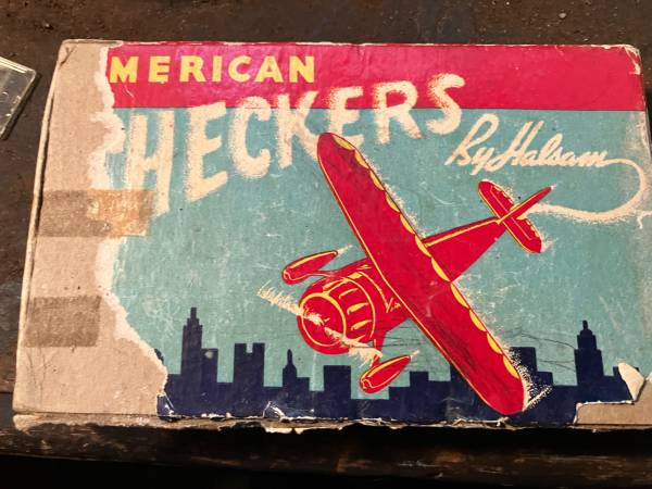 Halsam American checkers, wooden, in somewhat distressed original box displaying an airplane. The checkers themselves are embossed with images of different planes, globes, stars. So cool just to display. $5.