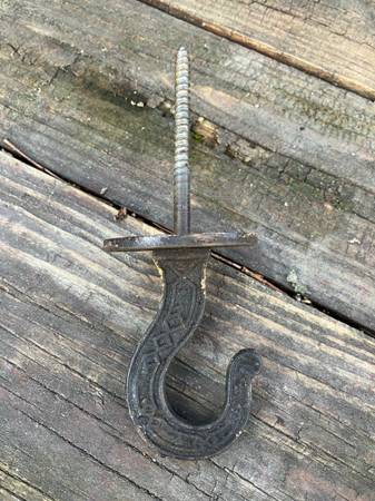 Single large hook (3 1/2 inches) w/round wall or ceiling plate and very long screw. Patented 1872. $4.