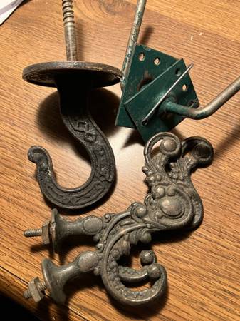 Pair of fancy brackets that jut out about 4 1/2 inches, would support a shelf about 3 inches wide, or could be used as hooks. $8.