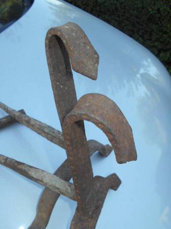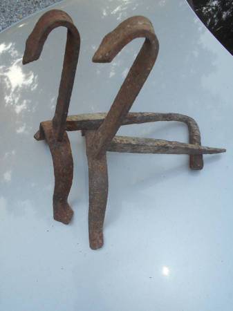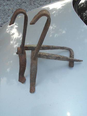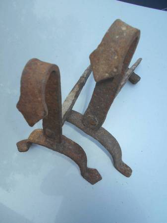 Matched pair of decorated blacksmith made andirons. They have faces made to look like snakes or frogs--some sort of reptile or amphibian. They are probably over 200 years old. Most likely go back into the 1700's The back ends that received the most heat from the fire are well worn. The front decorated face sections are fine. Neat old fireplace furniture with lots of character. Uncommon to show decoration of this nature. Lots of blacksmith time and skill went into these andirons. Good old wrought iron material. KWS
