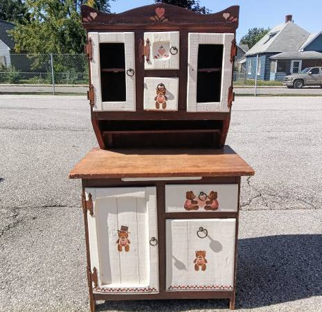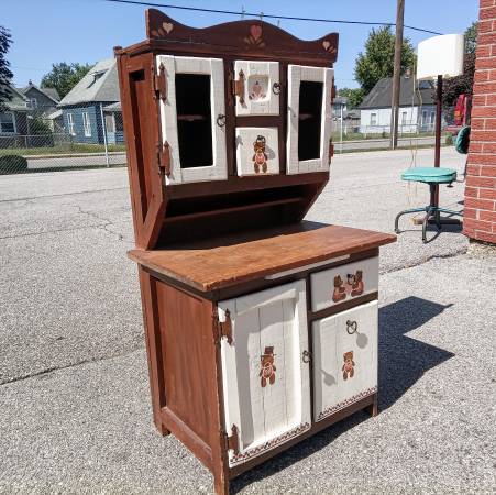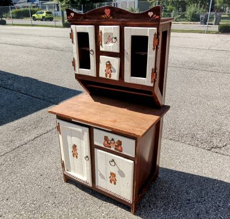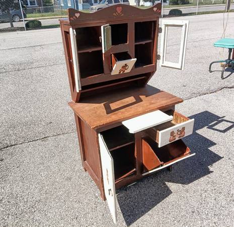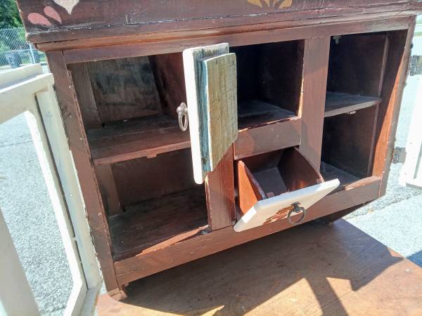 Circa early 1900s. Almost all solid wood, and I believe this piece might have been handmade--one of the drawers was made with wood from an old Lava Soap crate. Other neat details include a slide-out prep board and bin-type drawers. Some hinges were replaced at some point, and the painted details were later additions I believe. 25 x 17 x 45 inches.