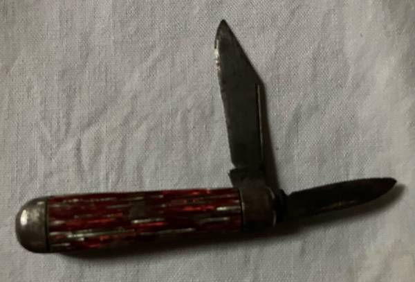 Folding 2-blade pocket knife,Inscribed on blade: Hammer brand and the logo. 3 inches long (folded). There's a patent number on the other blade but I can't read it. It's seen some wear, so $10.