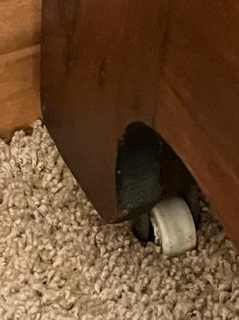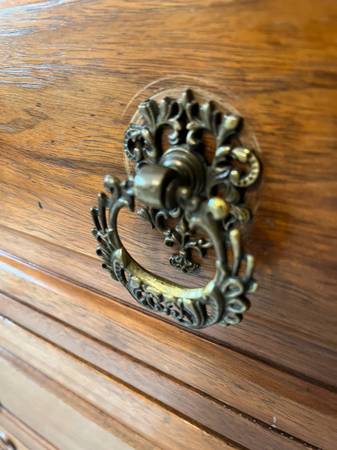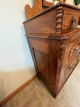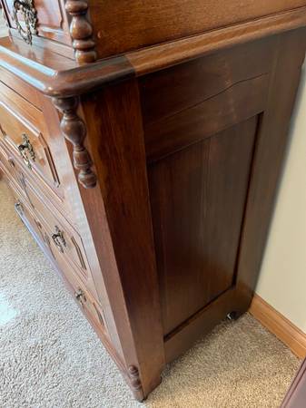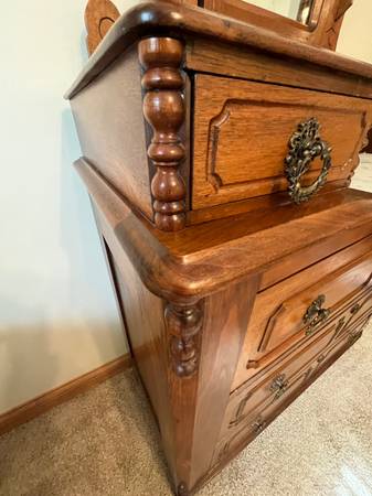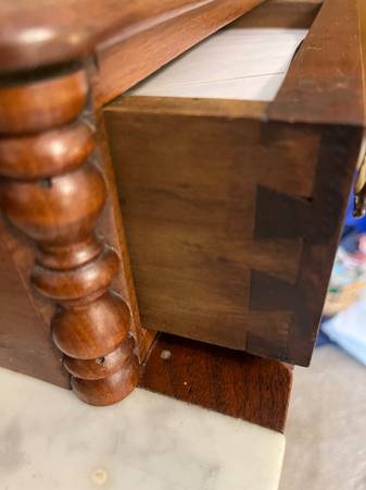 Beautiful piece with terrific finish. Everything is perfect. Refinished about 50 years ago - great patina. White marble insert is perfect. Locks on three large drawers and middle small jewelry...
