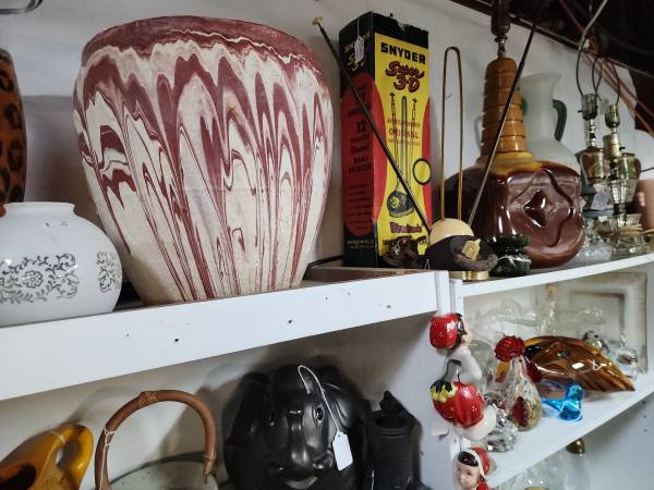 • Ceramics / Pottery: studio pottery, art pottery, USA pottery, Wedgwood, McCoy, Brush, Camark, a Van Briggle lamp with the original shade, a large Ozark Roadside Tourist pottery planter & more