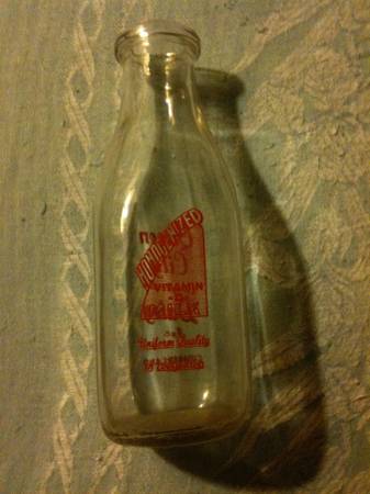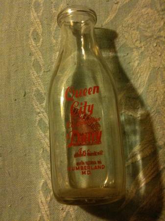 Queen City Co-operative Dairy Inc., Cumberland MD. "Homogenized Vitamin D Milk/Uniform Quality in Every Drop" Red embossed lettering on clear quart bottle. Excellent condition, no chips. $5.