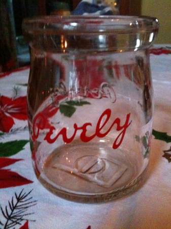 Pevely Dairy was in St. Louis and no longer exists. This is an odd 8-ounce (half pint) wide mouth bottle in near mint condition. The Name "Pevely" in script is molded on one side and written in red on the other. Along the bottom, molded, is the following: "8 oz. registered" and "Prop of Pevely Dairy Co St Louis, Mo/This bottle is never sold"