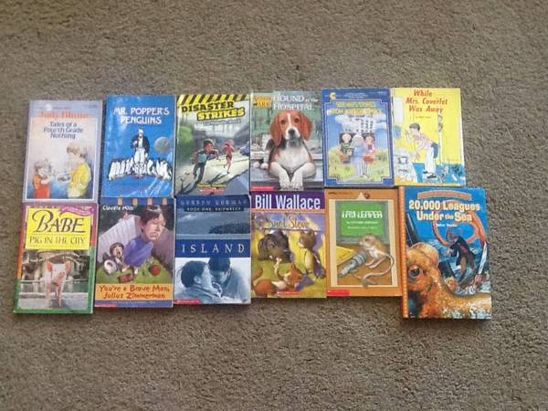 Pic #4 - Titles include: Tales of Fourth Grade Nothing by Judy Blume, Babe Pig in the City, Mr. Popper's Penguins, Disaster Strikes, Shipwreck Island by Gordon Korman, Hound at The Hospital, Sideways Stories from Wayside School, 20,000 Leagues Under the Sea (hardback) and more.