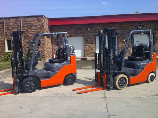 5000 LB. Capacity Toyota Forklift, Model # 8FGCU25, propane powered, new cushion tires installed, very well maintained, no leaks or issues, three stage mast, max lift height is 15'-9" high, side shifter, 42" or 48" forks, lbr., digital display, lights, strobe light, back up alarm, premium seat, ready to work today, two units are available, 2840 & 3180 hrs., we can offer delivery, propane tank is extra, come take look at the warehouse, asking $11,950., listed price is per unit, contact is Tim.