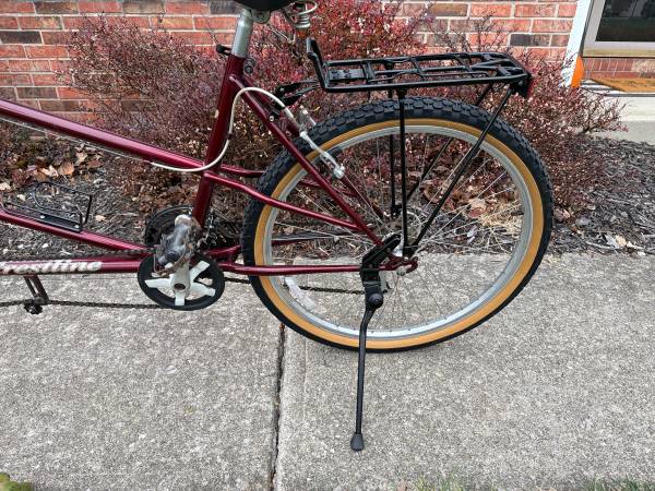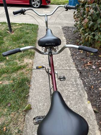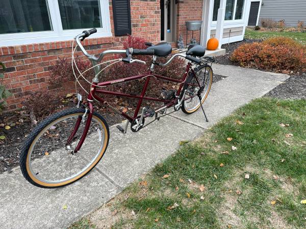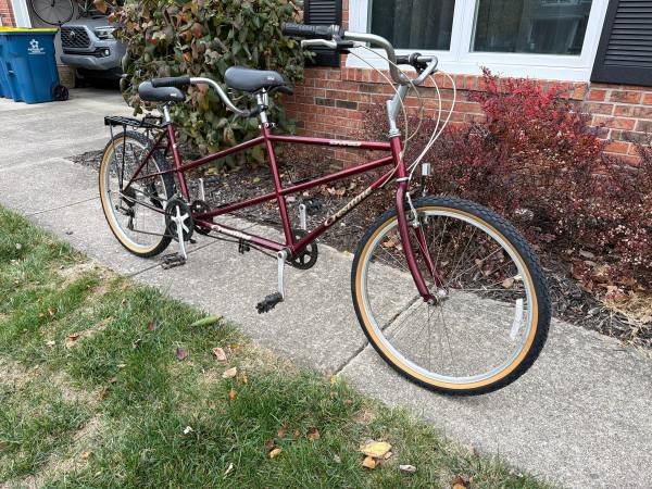 For sale a really nice DYNO crestline tandem with GT components. Beautiful maroon paint with champagne graphics. Brand new tires and tubes with tan gum wall tires goes great with the maroon paint. 21 speed Shimano grip shifters in perfect tune. GT stem and seats. Bike has been cleaned and tuned and is ready to go. Comes with water bottle cages, luggage rack, and brand new kickstand already installed. Asking 300 or best offer. Feel free to email or text to set up a test ride.
