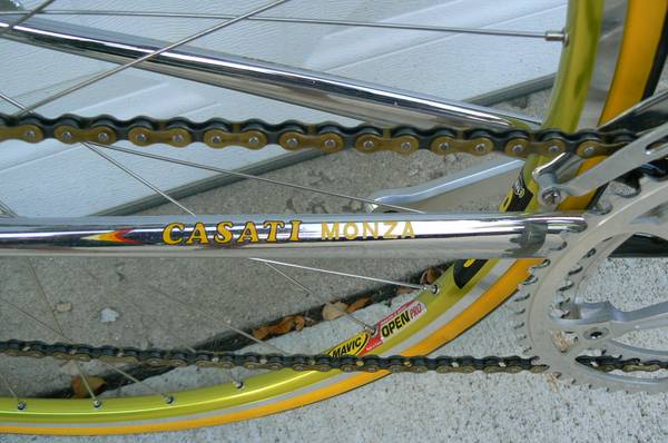 New 1985 Italian Casati frame with NOS Italian Nuovo Record Campagnolo components, 12 speed with NOS Italian Regina Oro 6 speed freewheel, NOS Italian Regina Oro chain, Italian Cinelli handle bar/stem, new housing/cables/bar tape, Italian Campagnolo seat post, new gold anodized Mavic Pro rims laced to Italian Campagnolo super Record hubs with new Michelin tires/tubes, 58cm Italian Columbus tubing frame center crank to seat post or 23. inch, 33 inch stand over or 83.7cm, 23 inch center to center top tube or 58cm, more suitable for a taller person. Never been ridden. Go to gallery to view my other bikes. show contact info