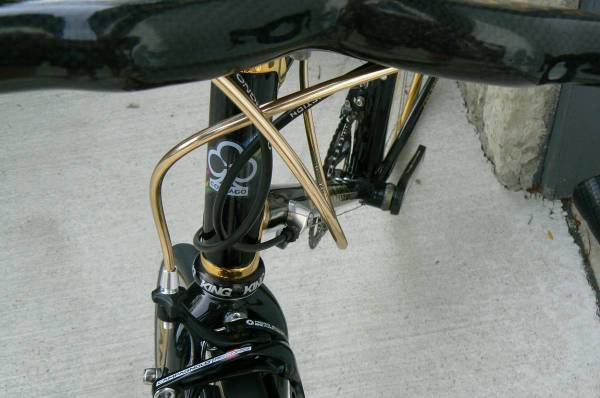 New rare Colnago Master Gold, this is a 2012 new frame bought from a bike shop in Arizona, according to the bike shop this was a re release of a 2009 Colnago Gold to commemorate the 55 Ann of Colnago which made only 99 frame with gold stay's in 2009, one of which was selling on Ebay for 13,000. The frame is Columbus Gilco tubing with Carbon fork and stay's, 22 inch frame center crank to seat post or 55cm, 22 inch C-C or 55cm, stand over 31 inch or 78cm, after receiving the frame it was build up with new 11 speed Campagnolo Record Carbon group set, Campagnolo Shamal gold rims, new Colnago Carbon handle bar, Campagnolo Record carbon seat post, new Colnago gold saddle. The bike was checked by Carmel Cyclery to make sure everything was working properly. The bike was never ridden. Was 9000 call Gabe show contact info
