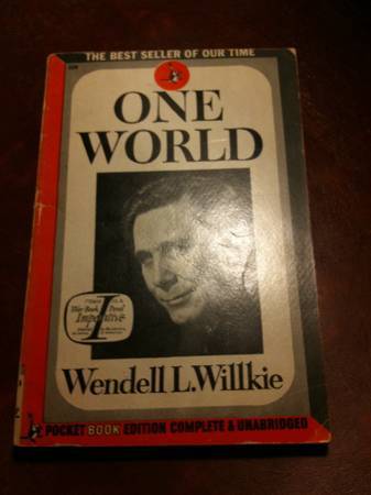 "Endorsed by the Council on Books in Wartime." The best selling work by Presidential candidate and Hoosier Wendell L. Willkie. 1943 Pocket Book Edition. Book is in good shape, binding tight. Glue has come away a bit just inside front cover. No marks, few wrinkles, really remarkably good condition.
