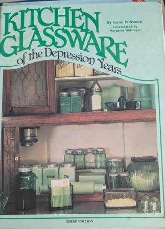 We are selling this Collectors Book published in Paducah, Ky written by Gene Florence as a special price and values guide of these Kitchen glassware items. This edition is specific to the Depression era years and is the result of three years development to publish. It is a collaboration with a coupe of other glass specialty authors and it is quite insightful and informative. Very complete and in great shape. The author is Gene Florence of Lexington, Ky. There are quite a number of color and black and white photos and drawings in this edition. The book weighs 1.5 pounds and is a color hardbound book that is 8.75” wide by 11.25” tall and about 1” thick. Very complete and this serves as a collection guide to help you gather and source more for your collection. You can also use it to place value and age of these keepsake glass pieces for yourself or others. It is delightful to browse and just have fun with decorative and memorable aspects of these Kitchen glassware items. The ISBN number is 0-89145-342-3. See the pictures for accurate views of the book.