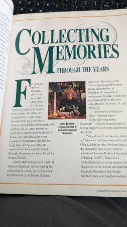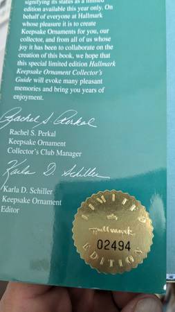 We are selling this Special Commemorative Edition of the Hallmark Keepsake Ornaments, A Collectors Guide, 1973-1993. This represents 20 years of Collectible Christmas memories from 1973 to 1993 with pictures and many pages. The certified book number is 02494 and is a Collectors Guide. Very complete and in great shape. The author is Clara Johnson Scroggins and she is a leading authority for the 1st 20 years of these collectible ornaments. There are hundreds of photos and 17 artists described with a total of 480 pages in the collection edition. The book weighs 4 pounds and 10.5 oz. It is a hardbound book that is 8.75” wide by 11.25” tall and over 1.25” thick in color with a protective cover in place all in great condition. Very complete and this serves as a collection guide to help you gather and source more for your collection. You can also use it to place value and age of these keepsake ornaments. It is delightful to browse and just have fun with decorative and memorable aspects of decorations for Christmas. See the pictures for accurate views. The ISBN number is 0875296726.