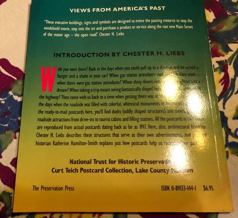 24 reproductions of old postcards, ready to mail, OR keep intact as a book. Wonderful pictures of roadside architecture gone by. Out of print. Like new. $5.