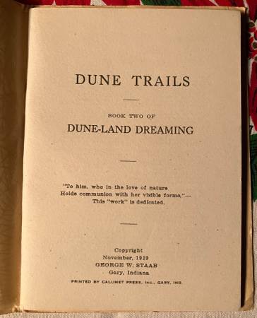 Dune Trails by Pegg Arm. Book Two, Duneland Dreaming. Copyright George W. Staab, 1929. Paperbound with decorative wax paper inner cover. 31pp. 6 1/2 x 4 1/2 inches. Thick paper. Excellent condition.
