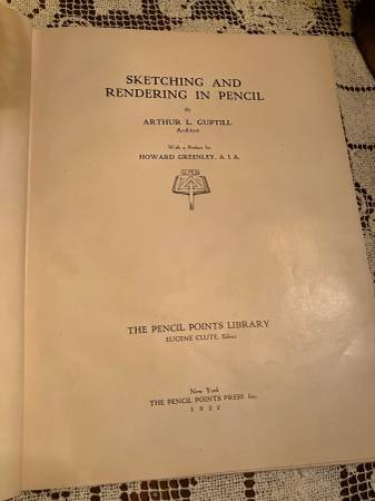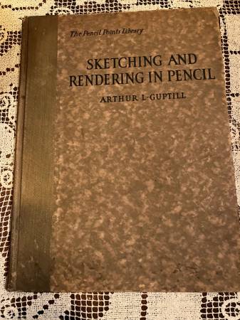 _Sketching and Rendering in Pencil_ Arthur Guptill (1922) Hardback, 186pp. Large format. From The Pencil Points Library, a practical guide to pencil drawing but also filled with many lovely prints. Clearly used, worn at the edges but intact, binding still tight. $8.