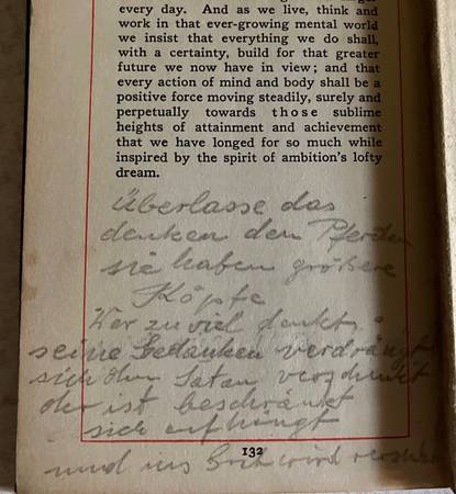 A beautiful little book, the 1912 hardcover edition of Larson's _Thinking for Results_. 132 pp. It has some wear but is still quite lovely. On the last page is some intriguing penciled writing in German! $5.