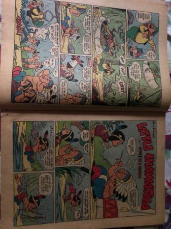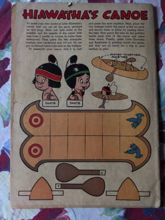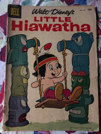 Walt Disney's Little Hiawatha comic 1957. Not very PC, to say the least, but the character is a positive one. $5. Well used comic book, entirely intact--great ads! On the back is a floating canoe one could cut out and assemble. $5.