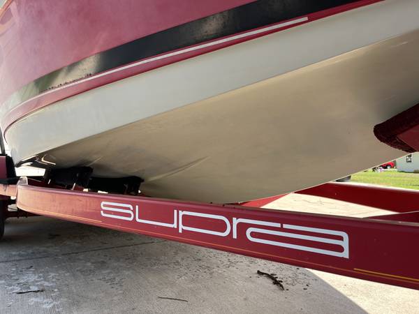 1989 Supra in very good condition. 1040 hrs (only 29 hours per year!!!). Runs great. Interior is nice...I just had the 4 main seats recovered. It's an '89, so it has a few bumps and bruises, but very good condition for the age. The picture of the cracked fiberglass is the rear of the swim platform. Easy to fix, but not necessary. Tandem axle trailer pulls great on the highway. Seats 8. Lots of power. Great, affordable and reliable family ski boat. Calls preferred over emails. NO texts. Leave a message if no answer. Thank you!