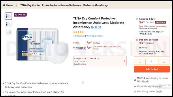 18 in pack, TENA Dry Comfort Protective Incontinence Underwear, Moderate Absorbency By TENA $6