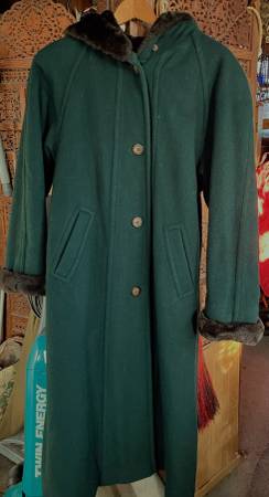 Rich forest green full length wool blend coat with plush-lined hood and cuffs. L.L. Bean. Four buttons down the front and another to tighten the hood in those freezing winds.