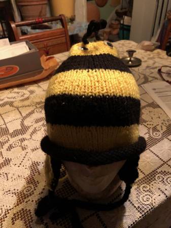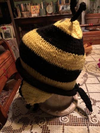 You've heard of a bee in your bonnet but how about a bee that IS a bonnet? Handknit yellow and black snug hat with ear flaps and braided ties, complete with eyes, antennae, and even a stinger....