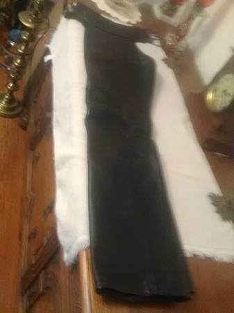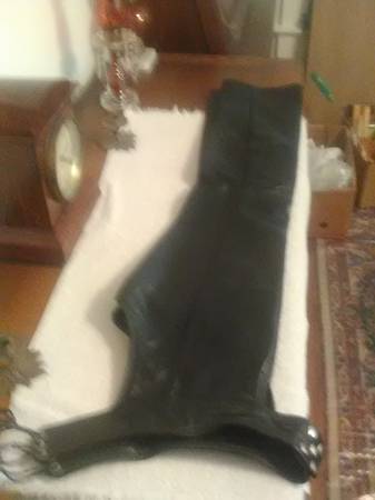 Black leather men's chaps, rarely worn, nice condition, adjustable snaps on front, adjustable ties on the back, 39-1/2" length top to bottom, waist size is adjustable from 29-34 waist size, 32-1/2" inseam, $75. If interested, please CALL show contact info