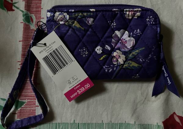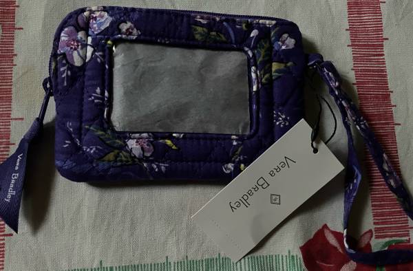 Brand new Vera Bradley zip-top ID case, quilted fabric, purple with flowers ("Wild Roses"). 6 inches by 3 3/4 inches. Outside window for ID, two inner pockets. Carrying strap. Hang-tag still on it,...