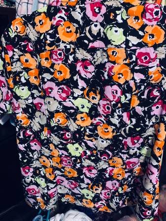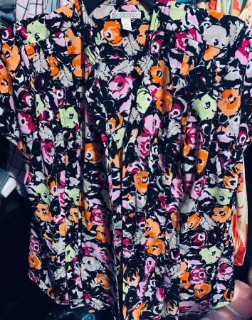 Bold, blushing ,artsy, chic ,complete floral printed bright multi neon orange ,black, grey, rose light pink ,green pastel flowers dressy button up