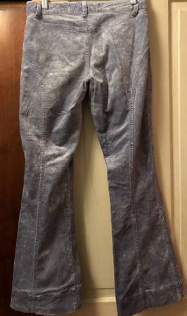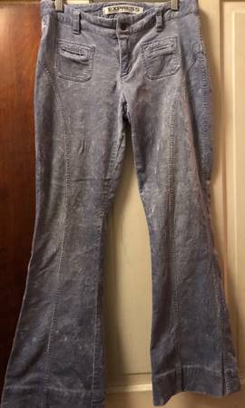 Vintage women's silvery light blue (the photo doesn't really show the color well) corduroy hip-hugger bell bottoms. Size 6. Express brand. Viscose/cotton blend, very soft. Small patch pockets in...