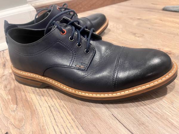 Selling a pair of Clarks men’s leather dress shoes in size 9.5. These are in excellent, almost-new condition — only worn one time. They feature a durable, non-slip sole, quality stitching, and a sleek navy blue leather finish with brown trim.