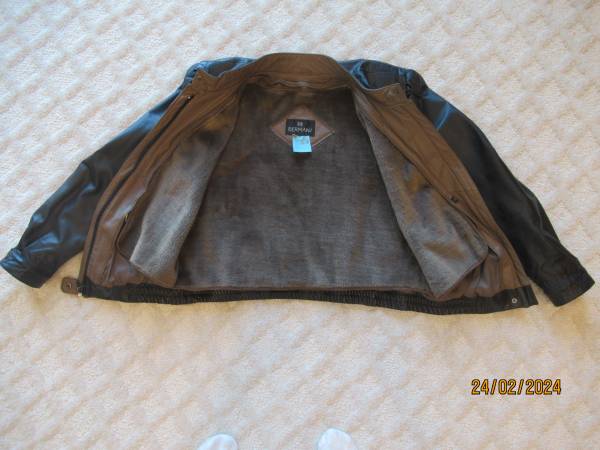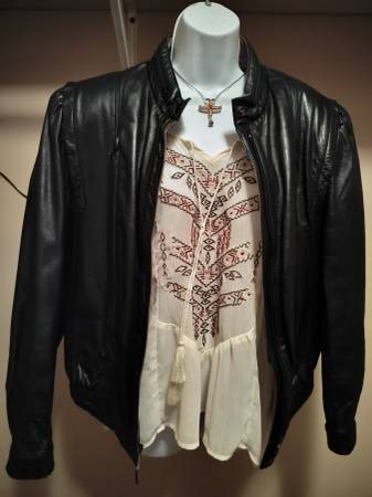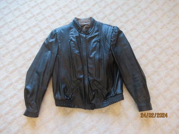Beautiful, like new, Ladies black leather jacket with warm zip out lining in brown. From Bermans Leather Store late 1980's. Ladies size 14. Porch pickup near 28 and 31 in Tipton County Indiana.