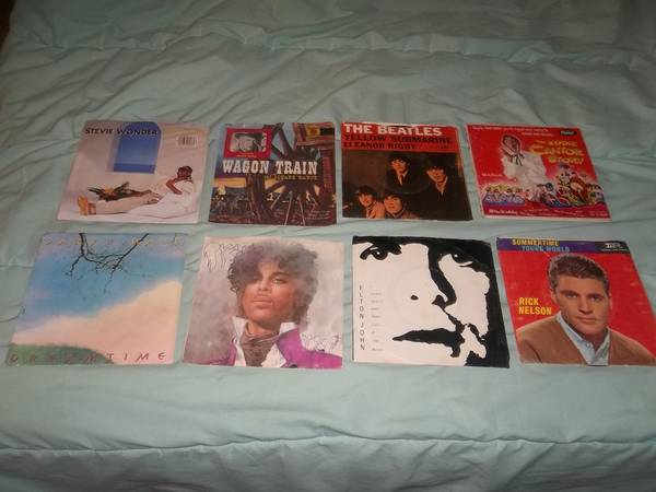 45 Records with Photo's: Frankie Laine Moonlight Gambler, Belafonte Act 3, The Monkees I'M Not Your, Elton John I Guess That's theyCall it the Blues, James Brown Living in America, Glenn Frey You Belong to the City,Arthur Fiedler Picnic, Bobby Vinton Miss America, Wagon Train & Square Dance, Stevie Wonder Go Home,Ride Kawasaki Nashville's hottest music, Andy Gibb I Just Want to be Your Everything, $20.00 ea. The Eddie Cantor Story $30.00