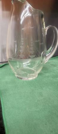 Crystal glass pitcher with edge cut cutter sailing ship and seagulls boat vintage 12 in tall