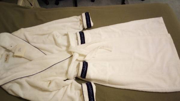 Saks Fifth Avenue Lady's Plush Robe White "L" By Caroline Cole, PARIS Elegant, Full length, White with delicate hand made Prune color trims Perfect as a wedding, birthday or anniversary gift. Size...