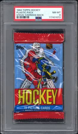 1984 Topps Hockey Plastic Pack with Steve Yzerman’s #49 rookie card on back - graded 8 Near Mint / Mint by PSA