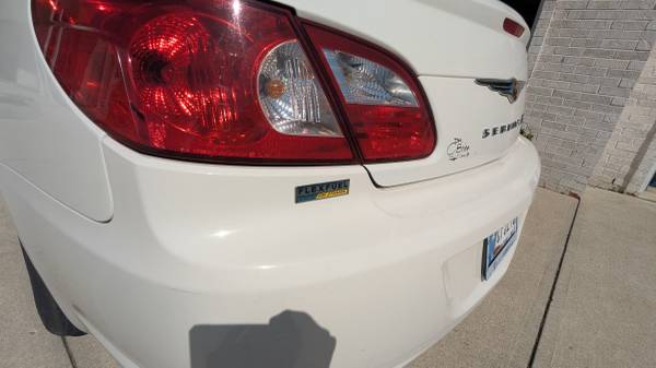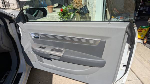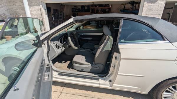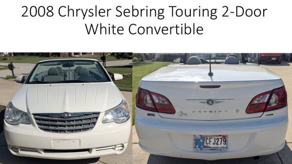 I am selling this 2008 White Chrysler Sebring Convertible Touring Edition 2-Door. It has a Personal Settings display that show Direction (N-S-E-W), Station call numbers, Outside temperature, etc. It is a Flex Fuel E-85 Ethanol capable vehicle as well. It has a tire pressure display, an AUX (auxiliary) jack, electric windows, AM-FM-CD-SAT radio settings. The Disc player plays MP3, WMA, CD, etc. It has Cigarette lighter power adapter up front. It also has cruise control, center console, and a digital and analog clock. Under the hood, there is easy access to the air filter section and fluids. For the age of this car, it has many features really. Also, it has Tilt-wheel, power steering, and ABS braking. Interior has dual air bags and side air bags, along with alloy wheels. Taking the convertible top up or down is automatic at the push of a button. The interior color is a light grey.