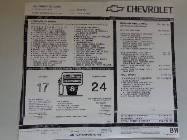I have a copy of the original window Sticker for this car, indicating the original equipment list, the original owner's manual and a current CARFAX report indicating NO accidents and NO damage and that the milage is accurate, (VIN#1G1YY22P0R5113778)
