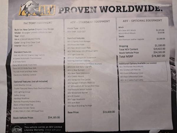 2020 Jeep Wrangler Rubicon....Many upgrades by AEV including 37" tires, 2.5" lift, AEV 4.56 gears, Savegre II wheels, AEV premium leather, AEV Zeon 10-S winch, AEV logo instrument cluster, AEV front and rear bumpers, AEV 7000 series LED off road lights, AEV front skid plate, also included is new OEM factory premium twill still in box soft top.